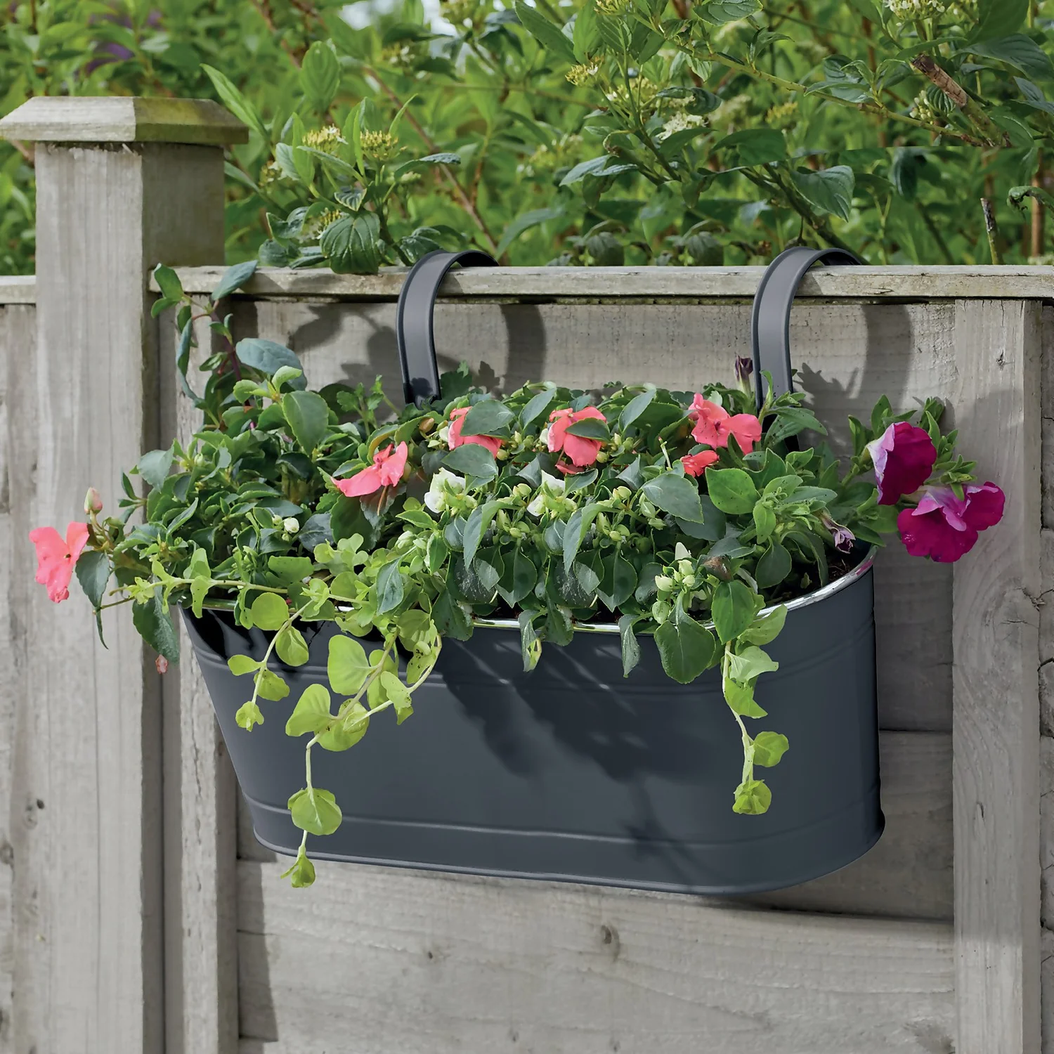 This 15in hanging metal grey planter is ideal for fences, balconies, walls, and railings. Its powder coated steel design means it is made to last.