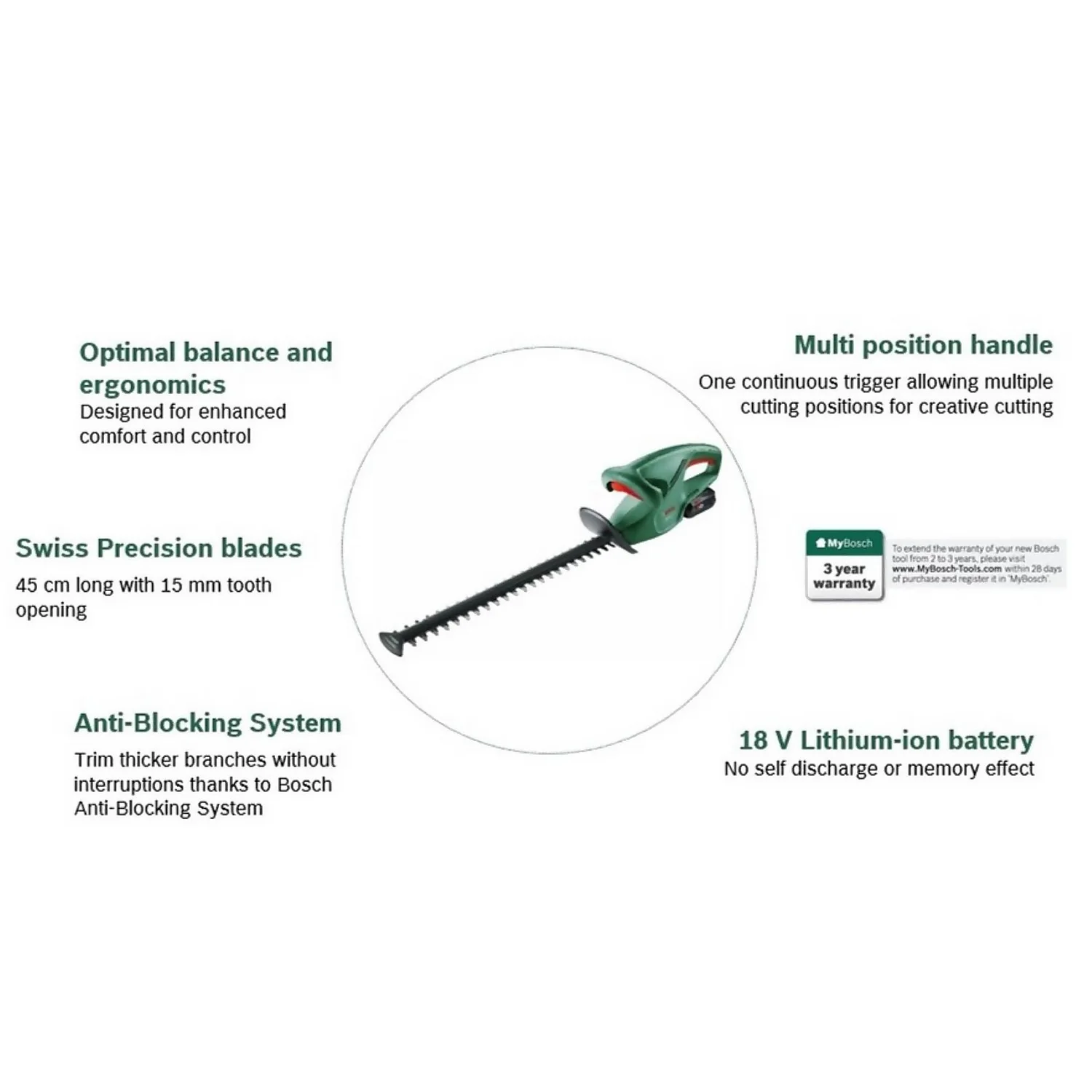 - Trim thicker branches without interruptions thanks to Bosch Anti-Blocking System