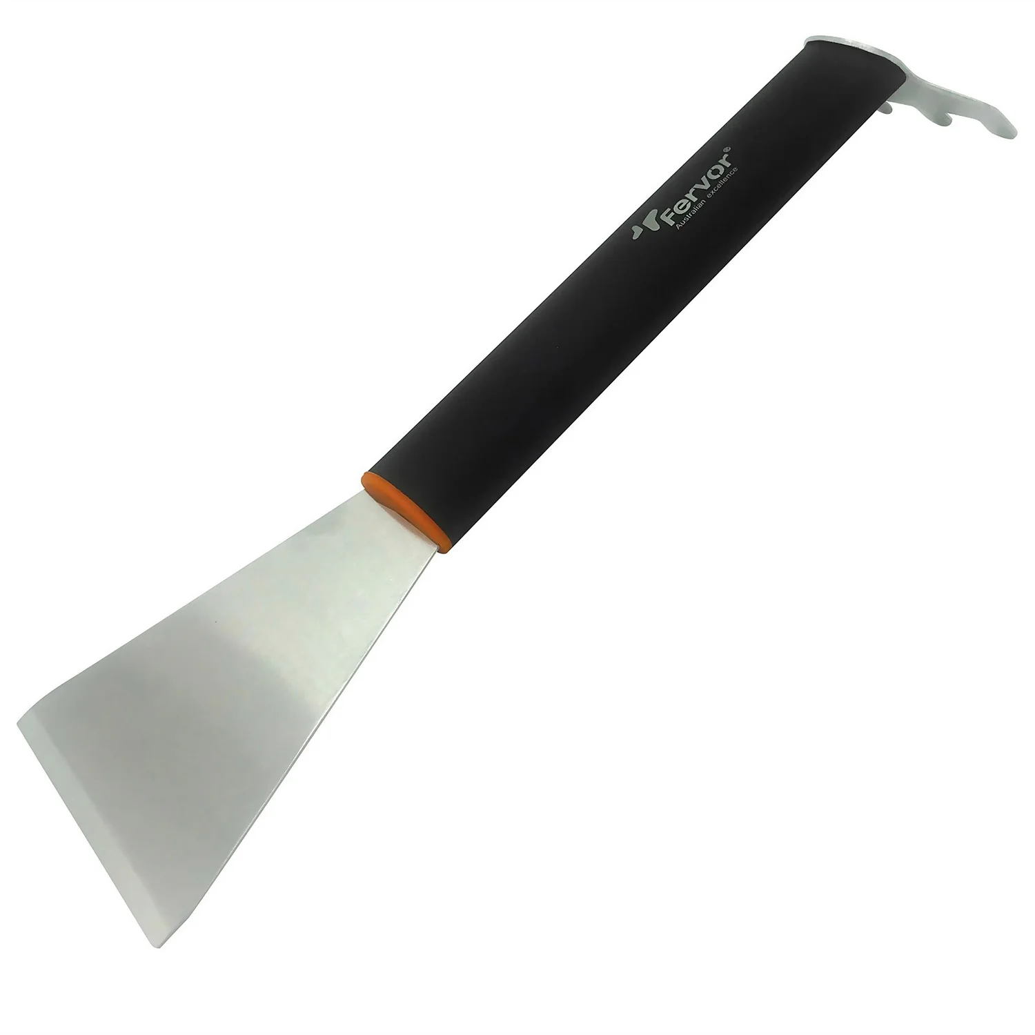 Stainless steel BBQ grill scraper with thermoplastic rubber coated handle.
