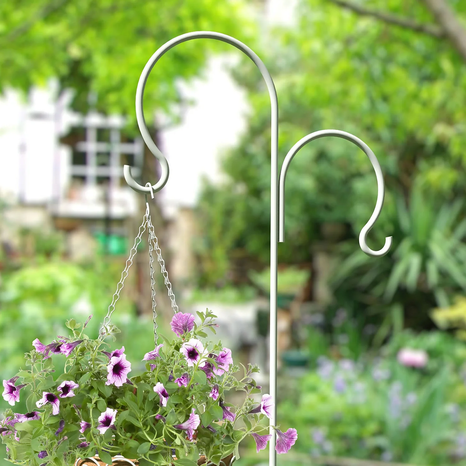 Add hanging items to your garden with help from the French Country Scroll Shepherd Hook. The round metal rods forming this hook add classic beauty to any surroundings. From hanging wind chimes and flowering baskets to tube feeders and lanterns, this hanger helps you achieve both bird feeding success and back garden beautification.