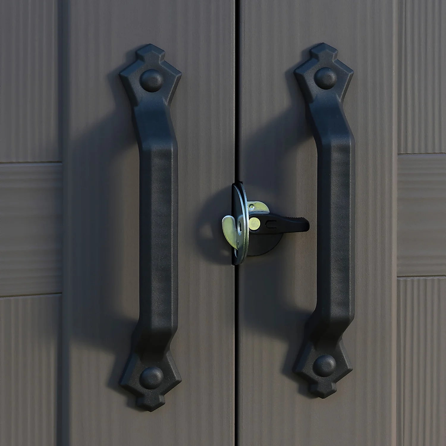 This elegant outdoor garden shed makes storing just about anything simple and elegant. The Keter 8 x 11 large apex shed is made out of a durable and weather-resistant resin that has a fine wood-like texture for looks and incorporates steel reinforcement for sturdiness. This shed is ventilated and comes with a window and skylight to allow plenty of natural light. The 11 x 8 has a heavy-duty floor – ideal for storing heavy items such as lawnmower and ATVs, a high ceiling that lets you move around with ease and wide double doors making it easy to enter and access everything you need. This shed is lockable (lock not included) and includes two shelves and is easy to assemble. Shed Footprint: 248 x 326 cm