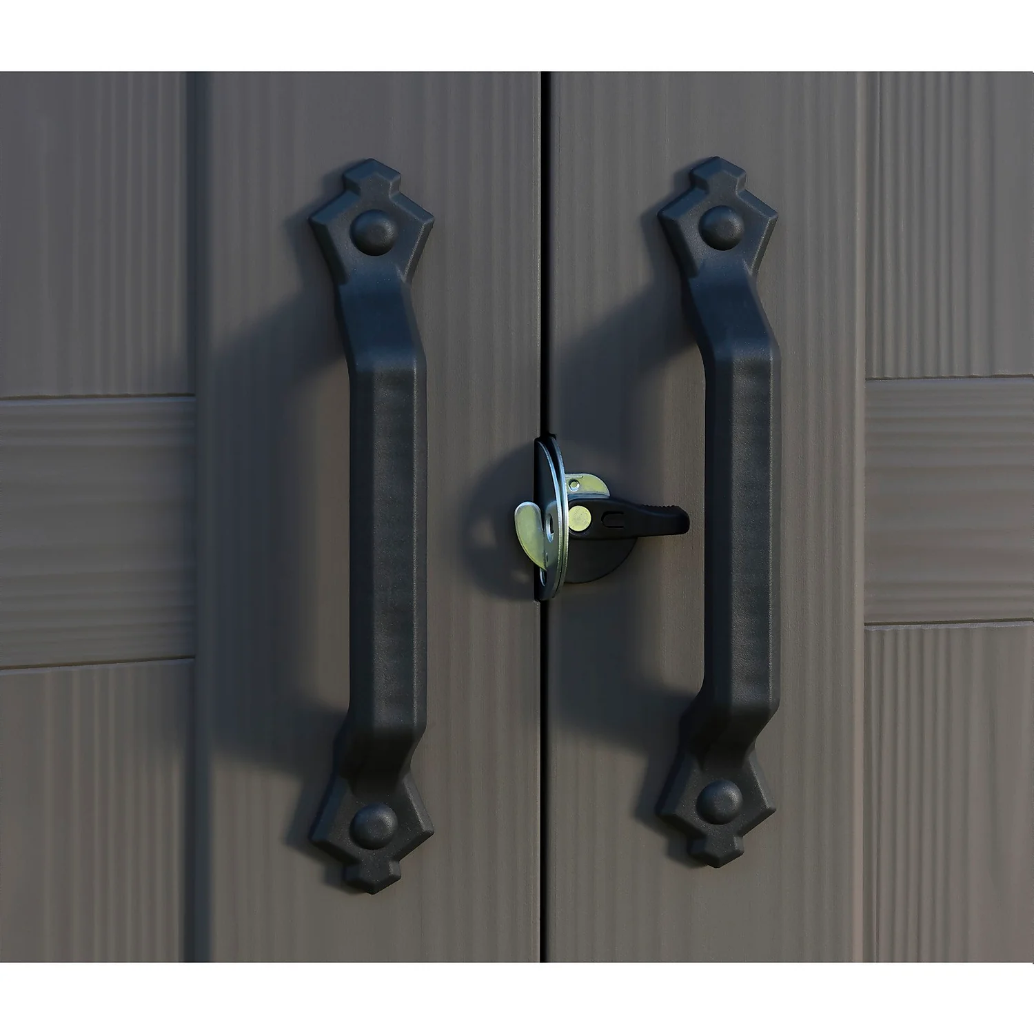 - Elegant wood effect exterior with double doors, plus ventilation grills for air circulation