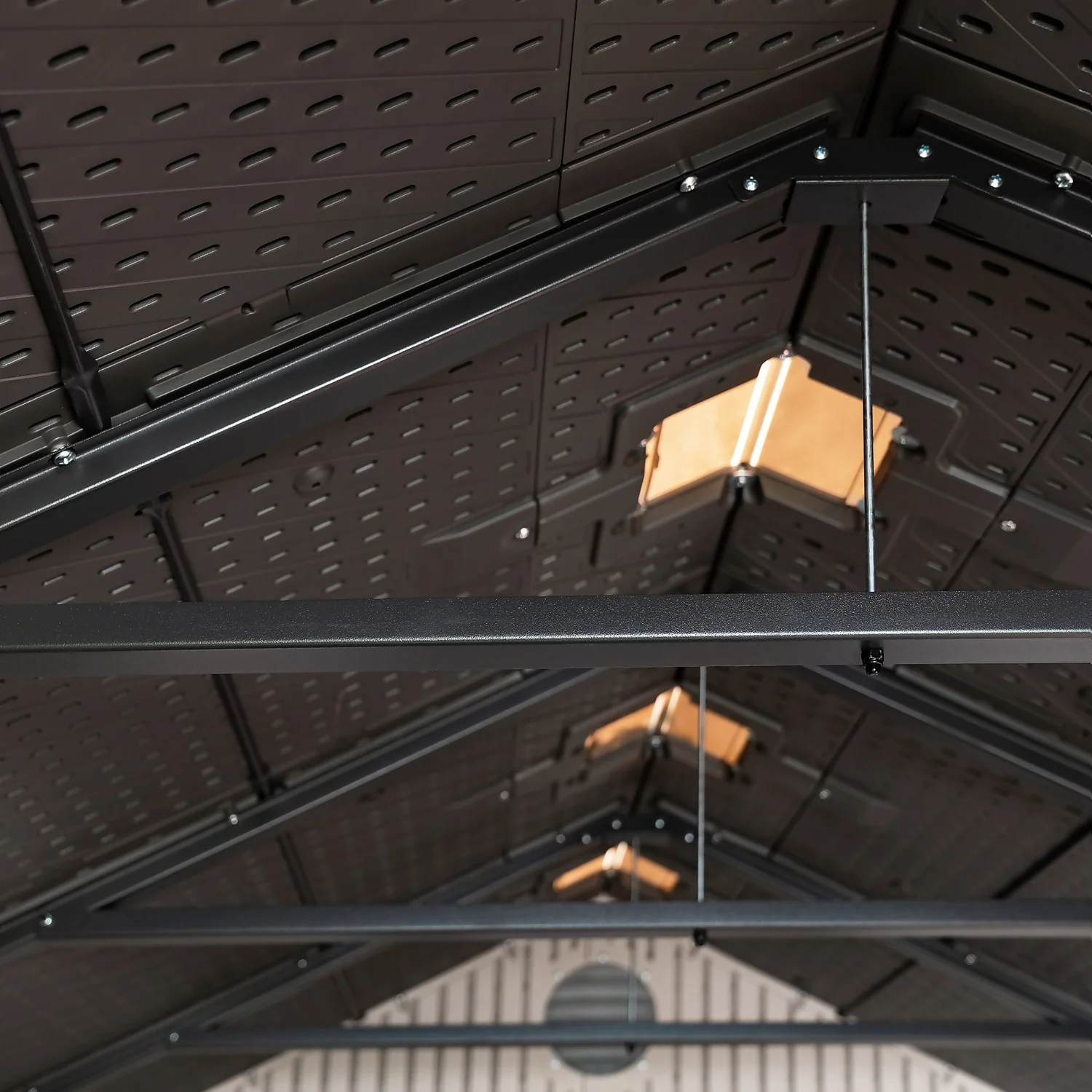 The steel-reinforced dual wall panels along with lockable doors safely secure your belongings. Steel trusses provide additional roof strength and the high pitched roof helps for quick drainage. The customizable shelving system allows you to store smaller items more effectively. The clean, stylish design of the shed requires no maintenance and will look great in your yard for years.