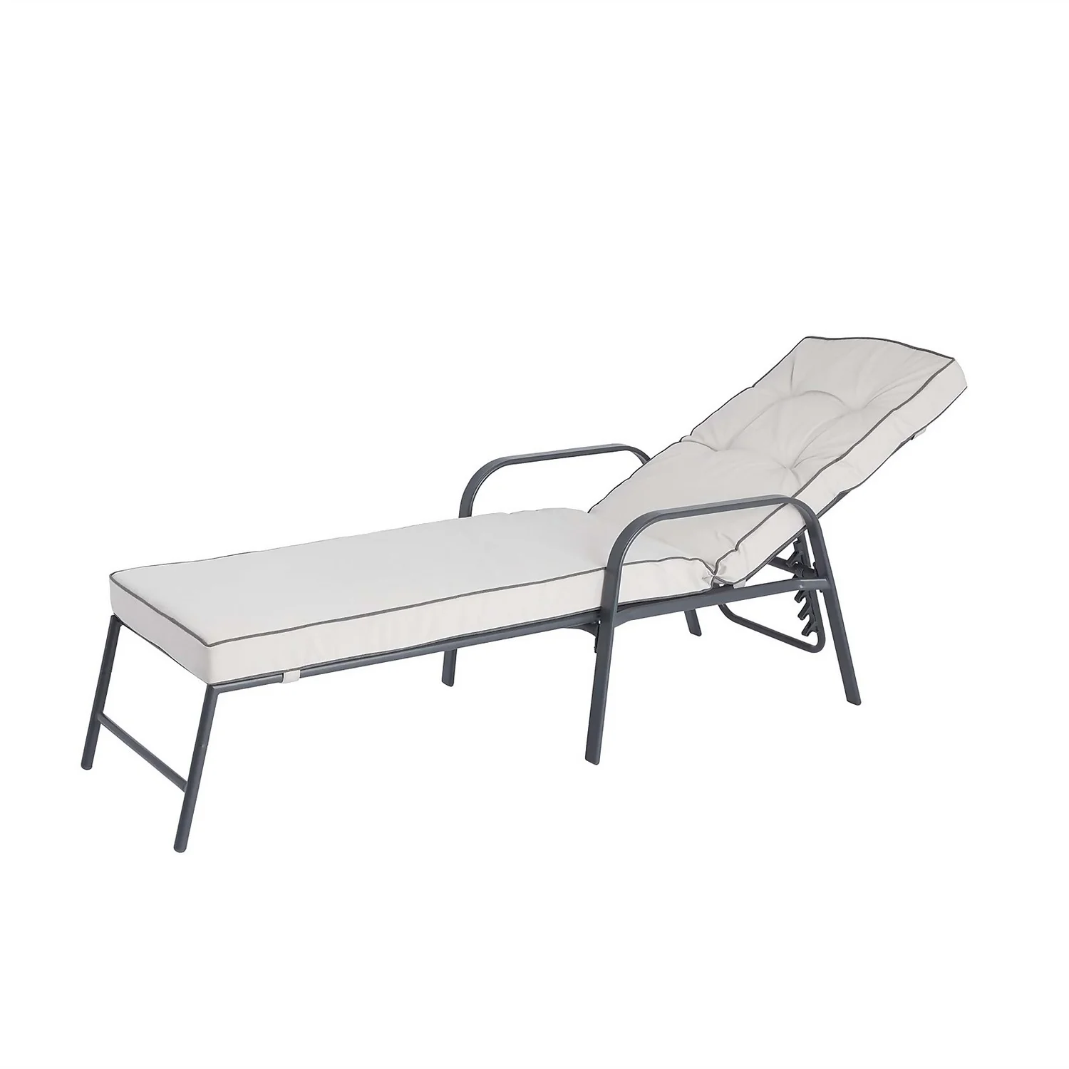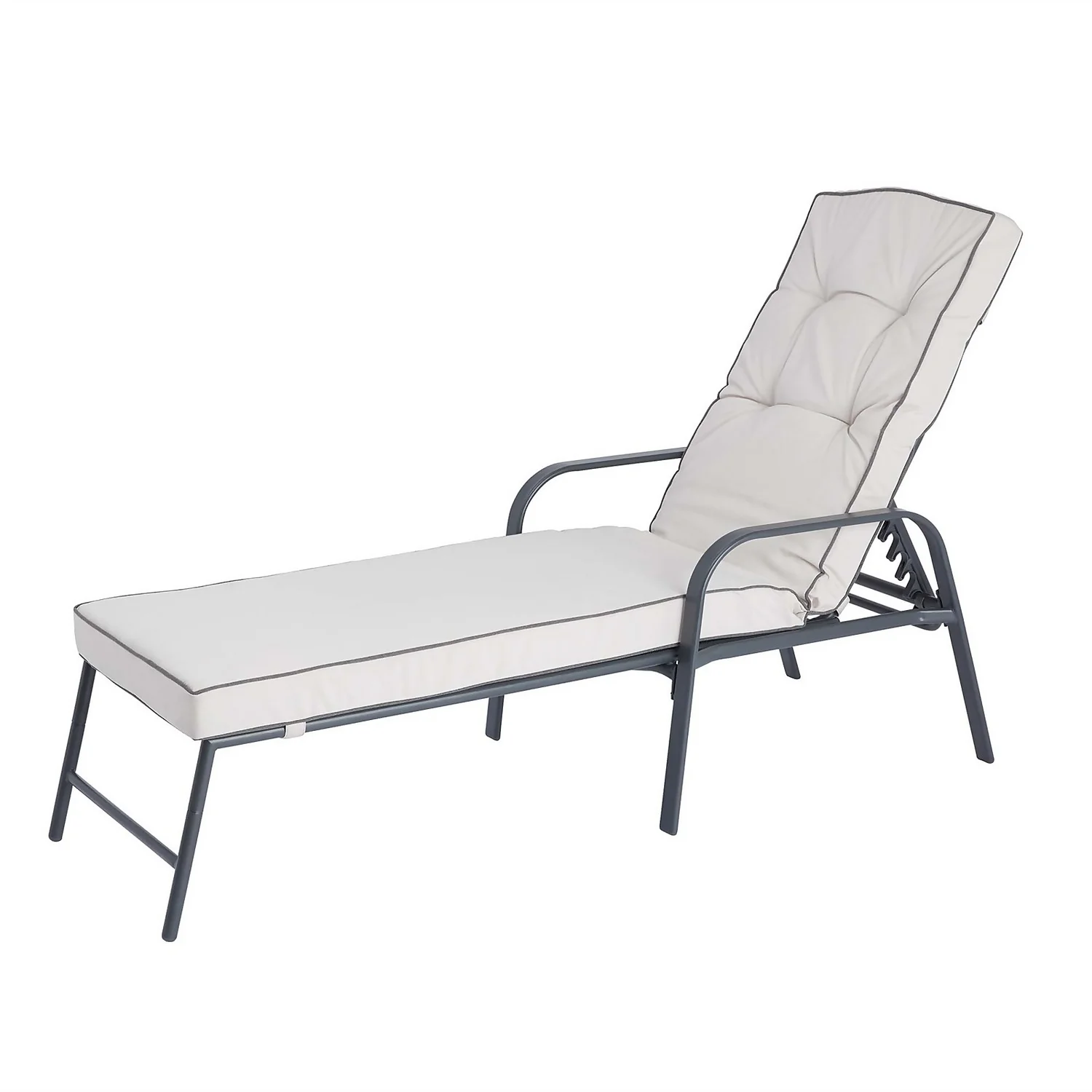 Cushion seat and back for comfort. Weather-resistant fabric. Adjustable lounger function.